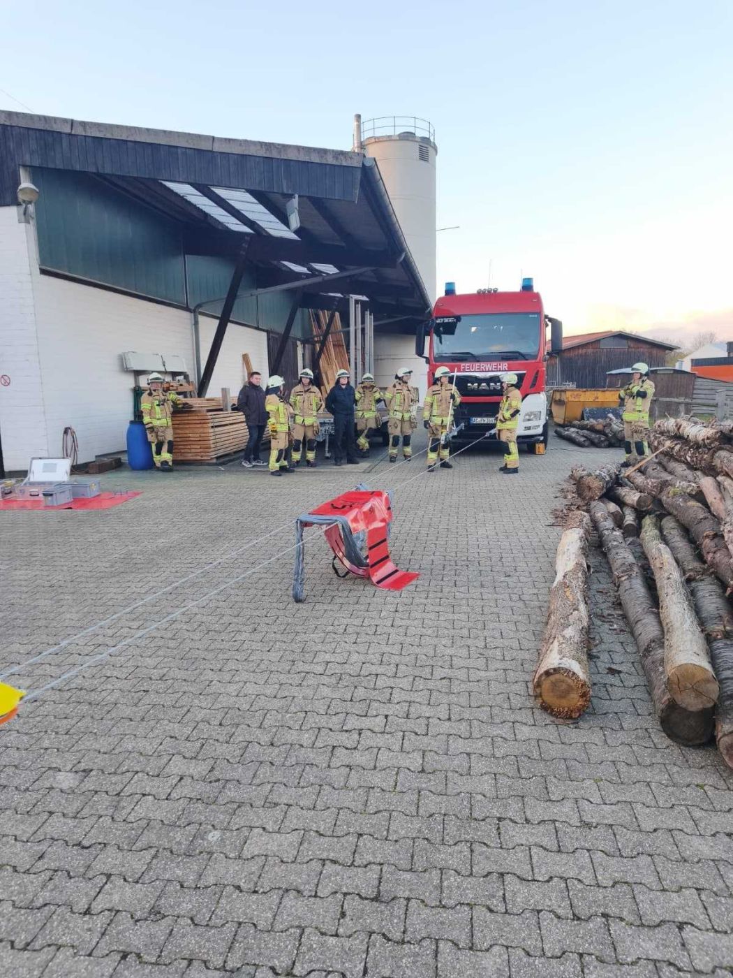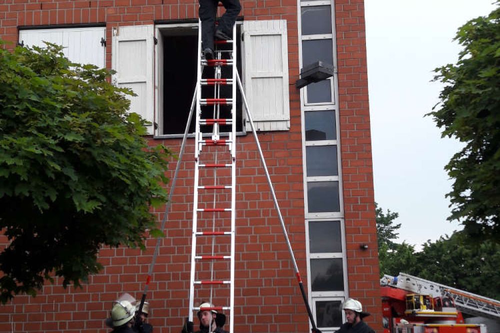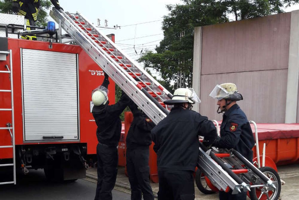 Ab und zu unterstützt unser Löschzug auch die Jugendfeuerwehr. Am 22.06.2019 hieß die Einsatzlage "Feuer Gewerbe" bei der Firma Holzbau Engels in Eschweiler. Es brannte im Silo und in einem angrenzenden Schuppen. 5 Personen wurden vermisst und mussten durch die Nachwuchsfeuerwehrleute gerettet werden. Die Übung war ein voller Erfolg.