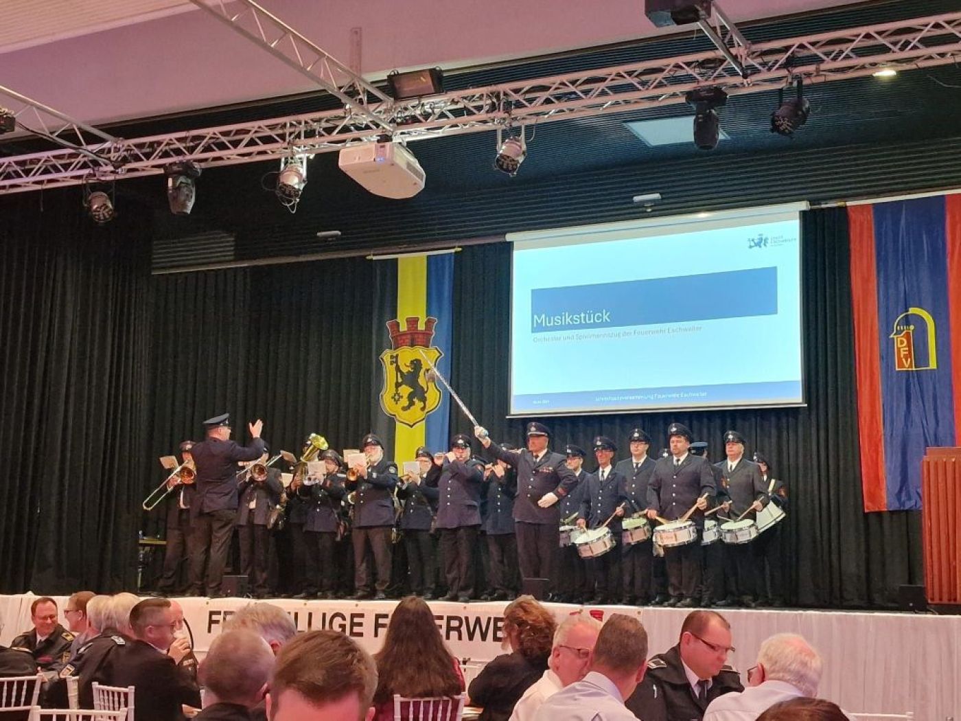 Am Freitagabend , 05.04.2024 konnte die Jahreshauptversammlung in der Festhalle Dürwiß durchgeführt werden. Über 250 Mitglieder der aktiven Wehr, der Jugendfeuerwehr, der Unterstützungsabteilung, der Ehrenabteilung sowie der Musikeinheiten kam pünktlich um 19:30 Uhr zusammen. Darüber hinaus konnten wir wieder zahlreiche Gäste, an deren Spitze unsere Bürgermeisterin Nadine Leonhardt, der stellvertretende Kreisbrandmeister Joachim Wynands, das Mitglied des Bundestages Claudia Moll und das Mitglied des Landtages Stefan Kämmerling, begrüßen. Neben Vertretern aus Politik und Verwaltung der Stadt Eschweiler besuchten uns auch Freunde und Mitstreiter von Nachbarfeuerwehren, Hilfsorganisationen und des THW.