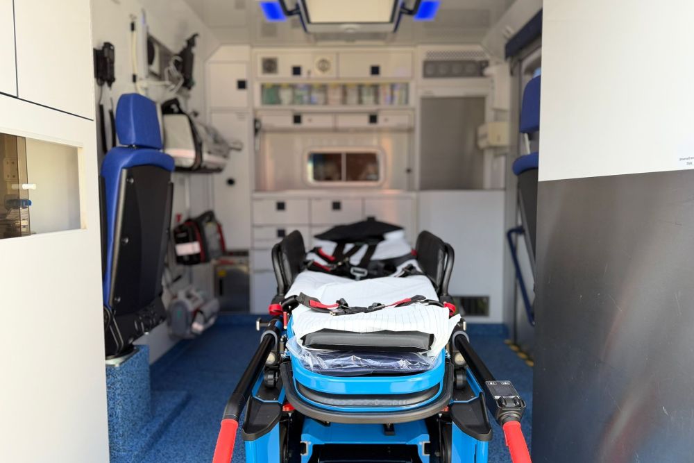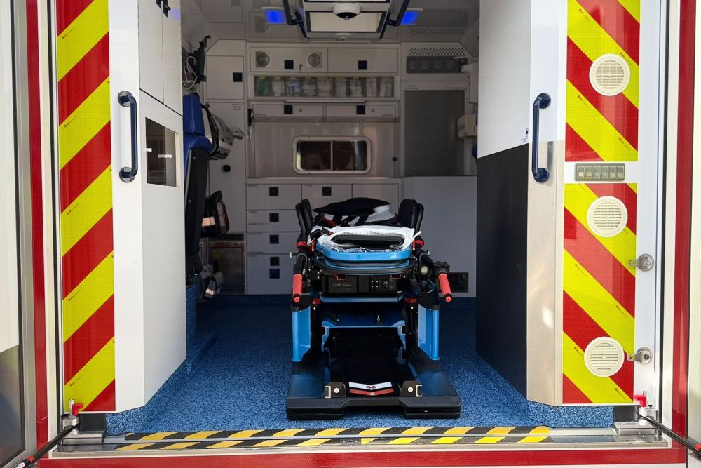 Zur Verbesserung der medizinischen Versorgung und der Arbeitsbedingungen der Einsatzkräfte verfügt der Rettungswagen über eine elektrohydraulische Fahrtrage, die ein besonders rückenschonendes Arbeiten ermöglicht.