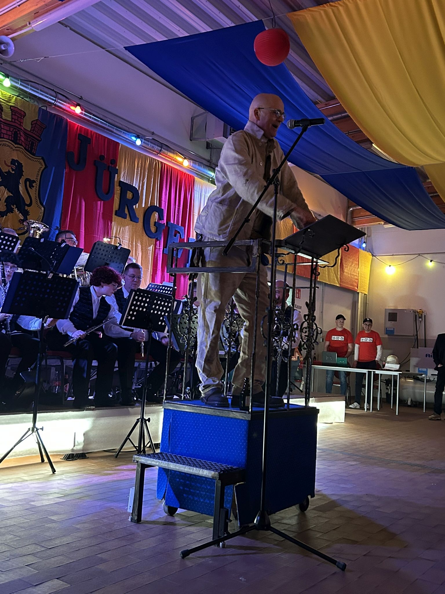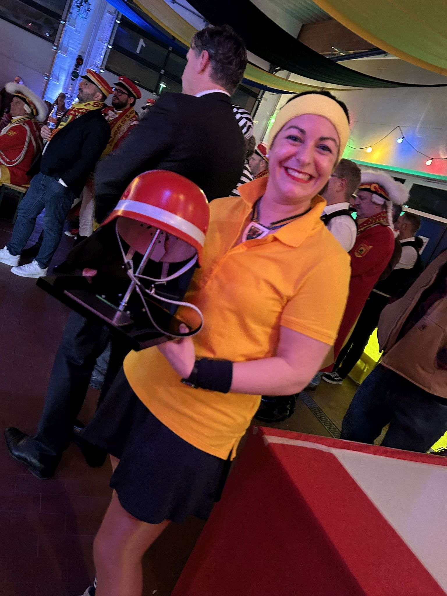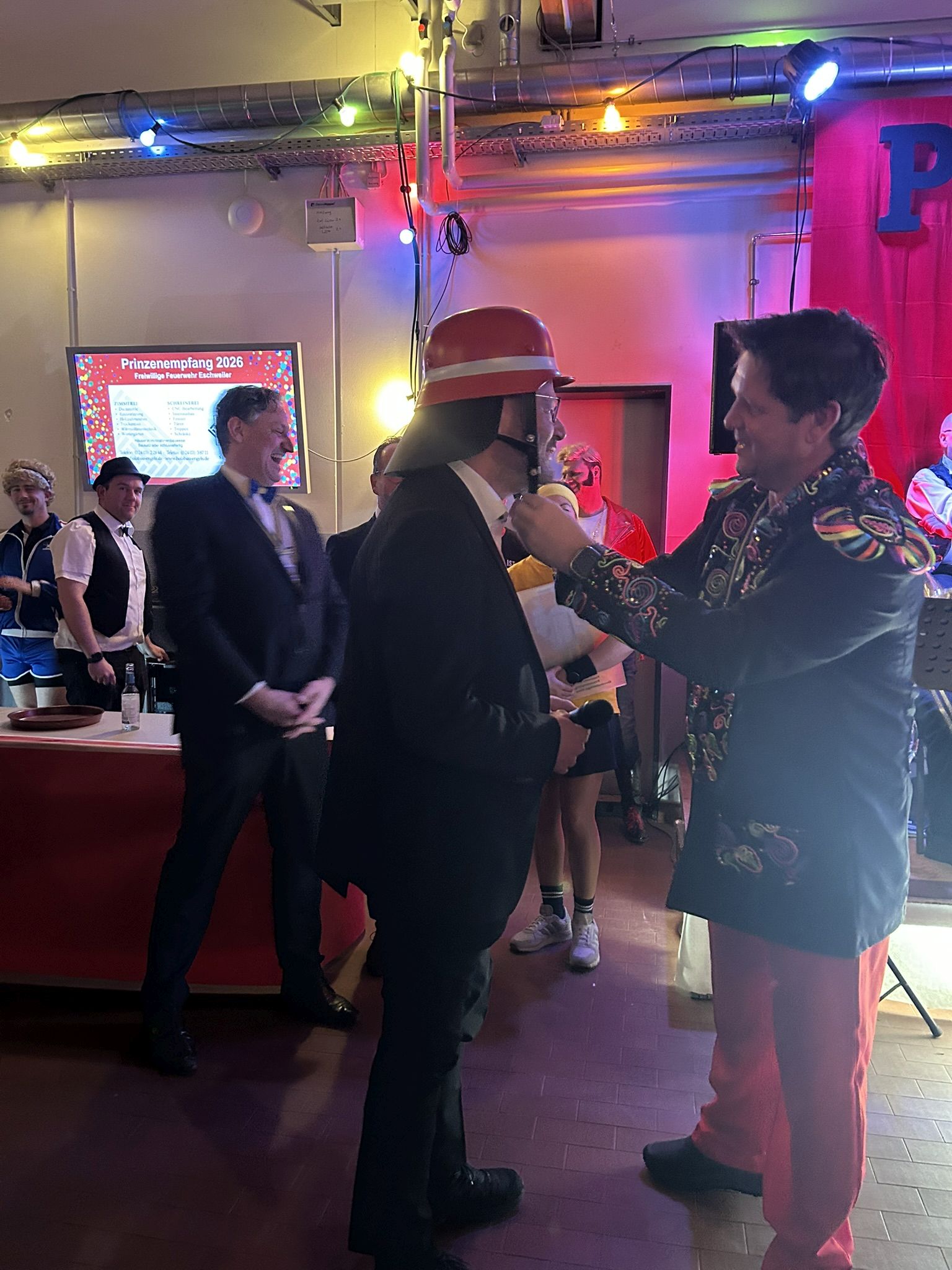 Danach folgte ein weiterer Höhepunkt jeden Prinzenempfangs. Die Verleihung des Ehrenhelms 2026! Viele herausragende Vertreter aus Lokalpolitik, Karneval, Ehrenamt und öffentlichem Leben in Eschweiler haben diesen Ehrenhelm in den vergangenen mehr als 20 Jahren erhalten. Unser Ehrenhelmträger 2024 Guido Massmeier von unseren Freunden vom THW stand uns als Laudator ein weiteres Mal zur Verfügung und machte es bei seiner gelungenen Rede spannend, wem denn in diesem Jahr diese Ehre zu Teil wurde. Wie wir durch Guidos Worte lernen durften, ist unser diesjähriger Ehrenhelmträger bereits seit 25 Jahren in Eschweiler angekommen und tätig. Kein geringer als der Geschäftsführer unseres St. Antonius Hospitals, Elmar Wagenbach, durfte den Ehrenhelm 2026 aus den Händen von Christian Haake entgegennehmen.