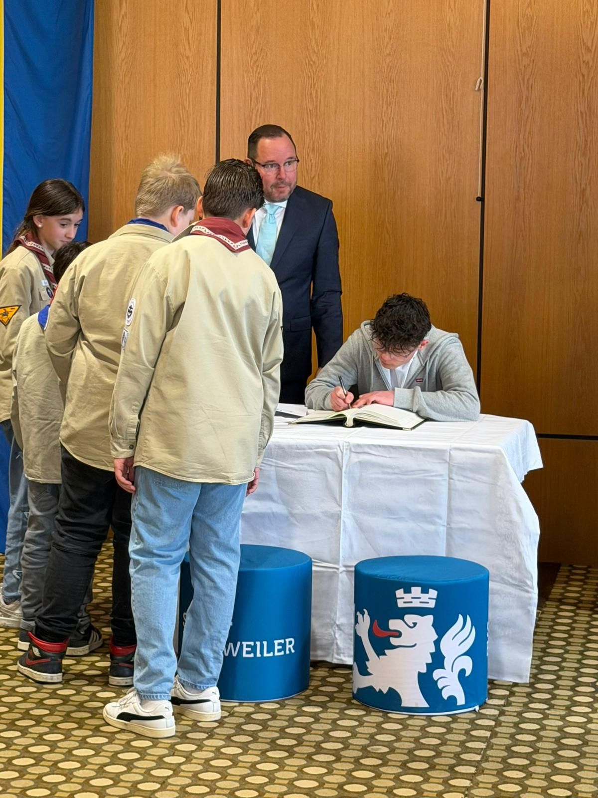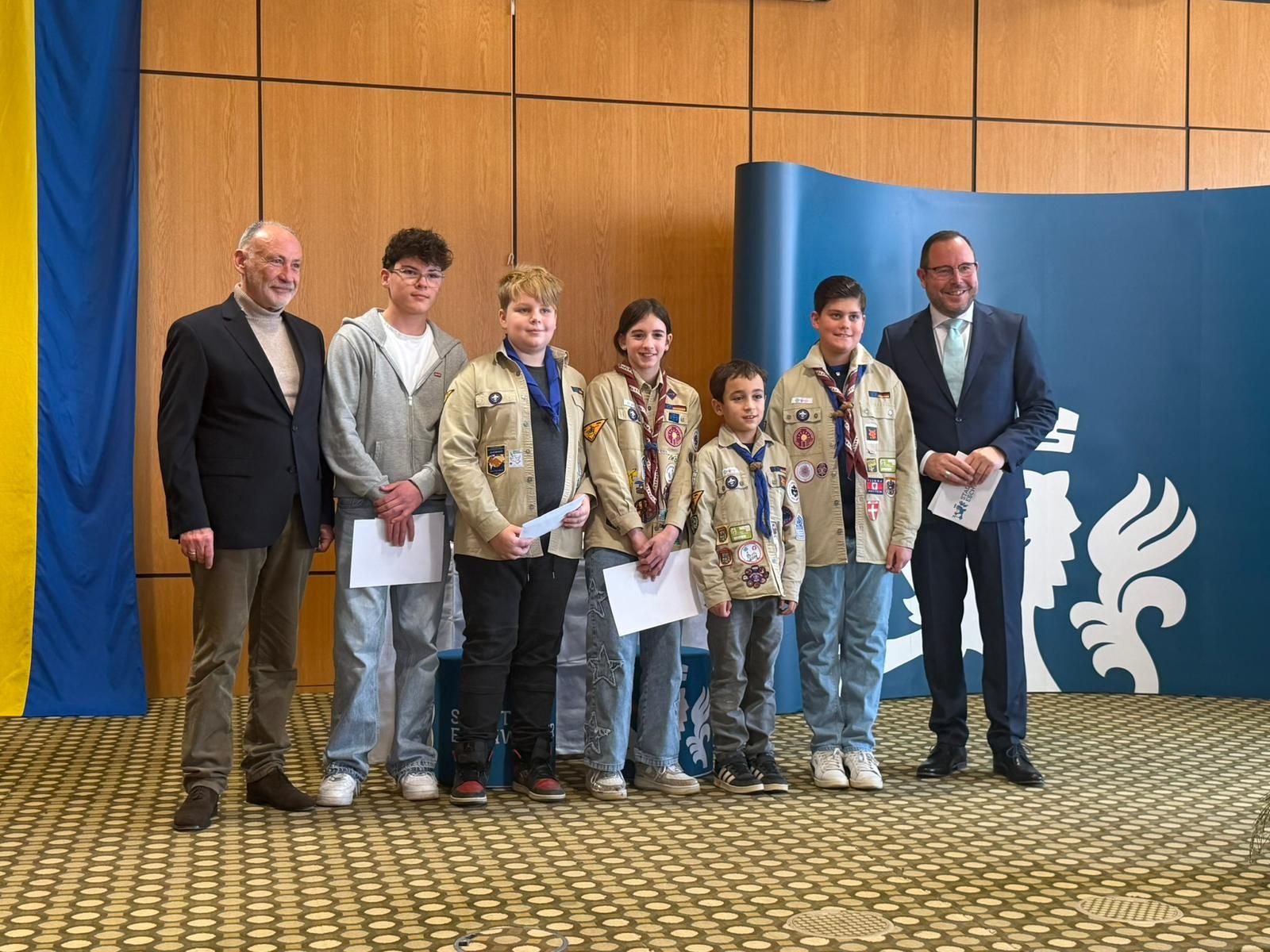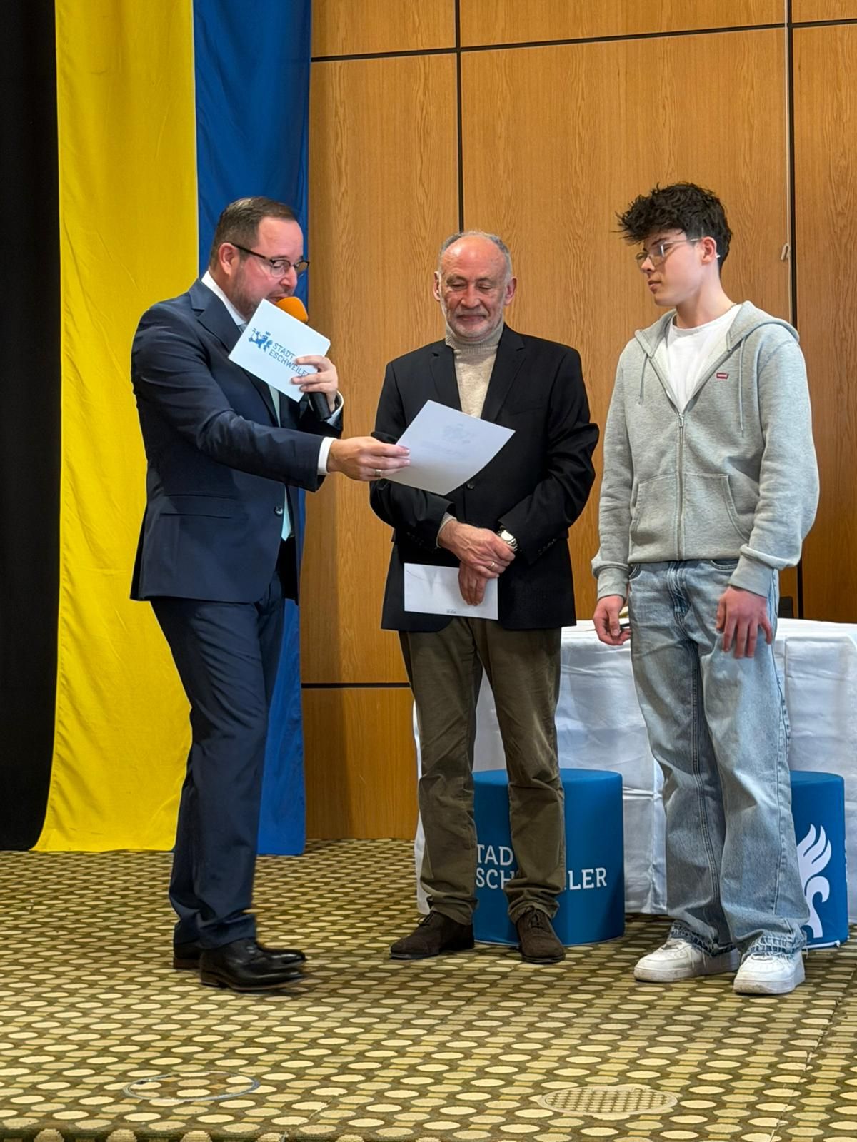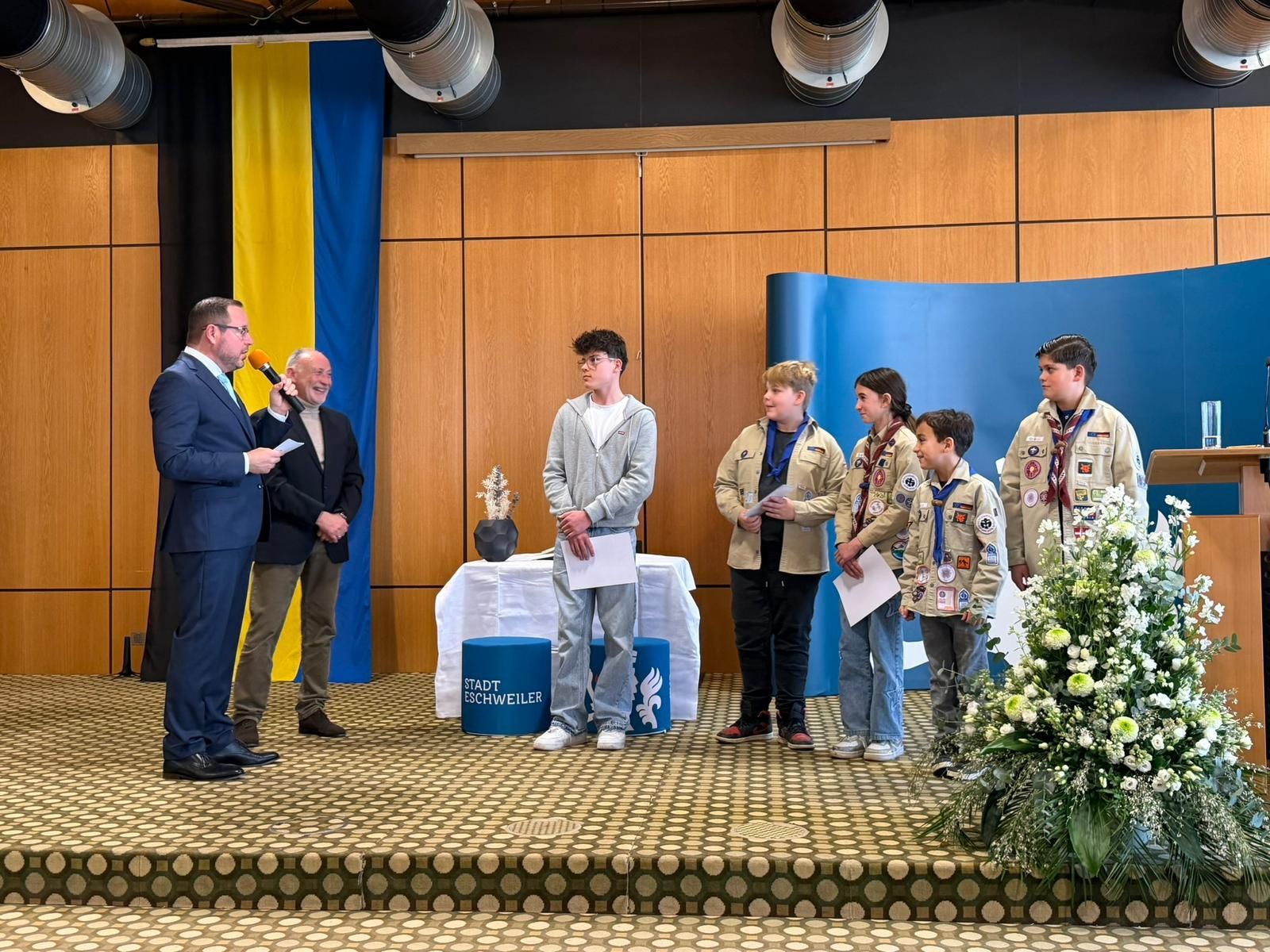 Danach folgte ein weiterer Höhepunkt jeden Prinzenempfangs. Die Verleihung des Ehrenhelms 2026! Viele herausragende Vertreter aus Lokalpolitik, Karneval, Ehrenamt und öffentlichem Leben in Eschweiler haben diesen Ehrenhelm in den vergangenen mehr als 20 Jahren erhalten. Unser Ehrenhelmträger 2024 Guido Massmeier von unseren Freunden vom THW stand uns als Laudator ein weiteres Mal zur Verfügung und machte es bei seiner gelungenen Rede spannend, wem denn in diesem Jahr diese Ehre zu Teil wurde. Wie wir durch Guidos Worte lernen durften, ist unser diesjähriger Ehrenhelmträger bereits seit 25 Jahren in Eschweiler angekommen und tätig. Kein geringer als der Geschäftsführer unseres St. Antonius Hospitals, Elmar Wagenbach, durfte den Ehrenhelm 2026 aus den Händen von Christian Haake entgegennehmen.