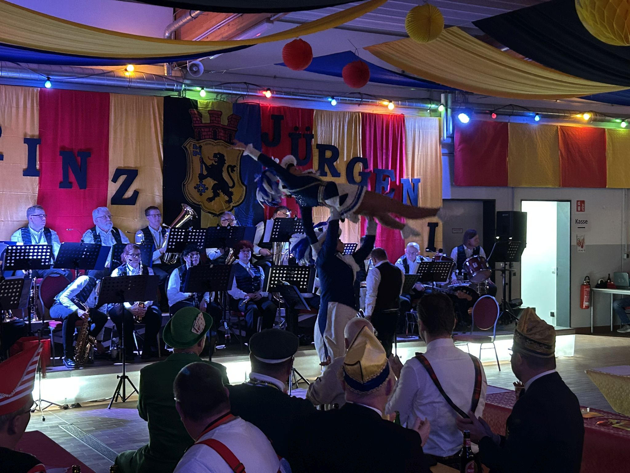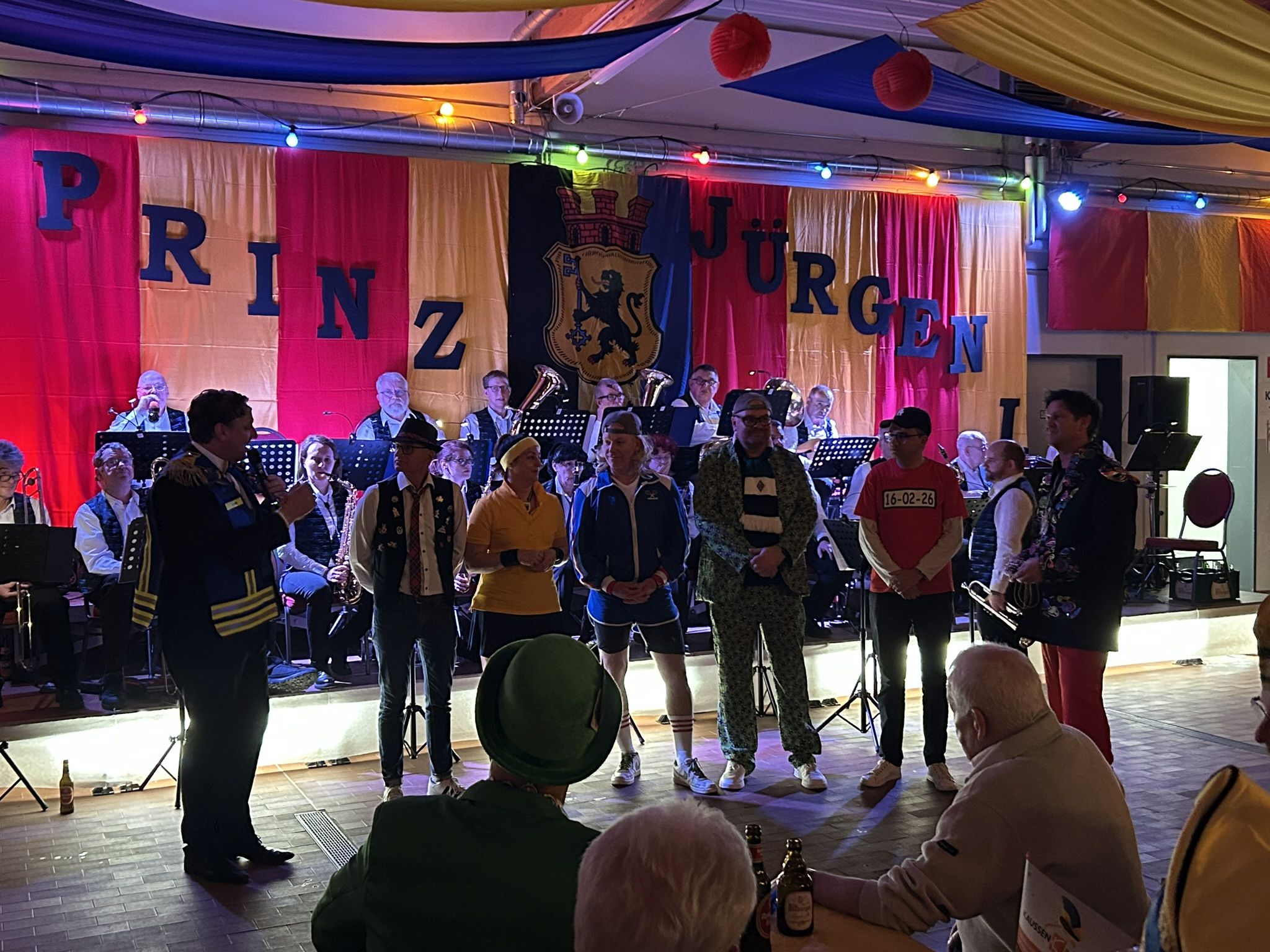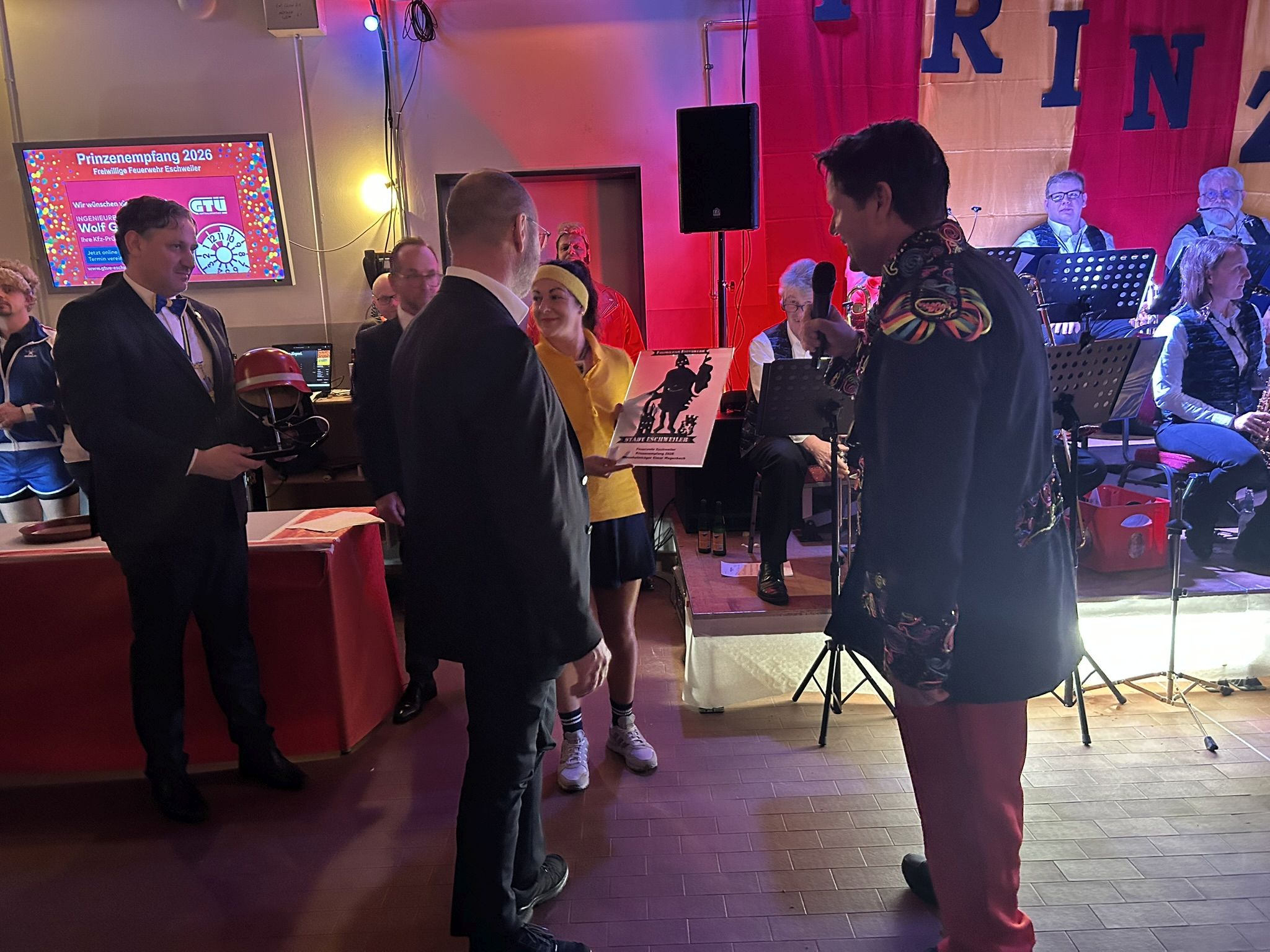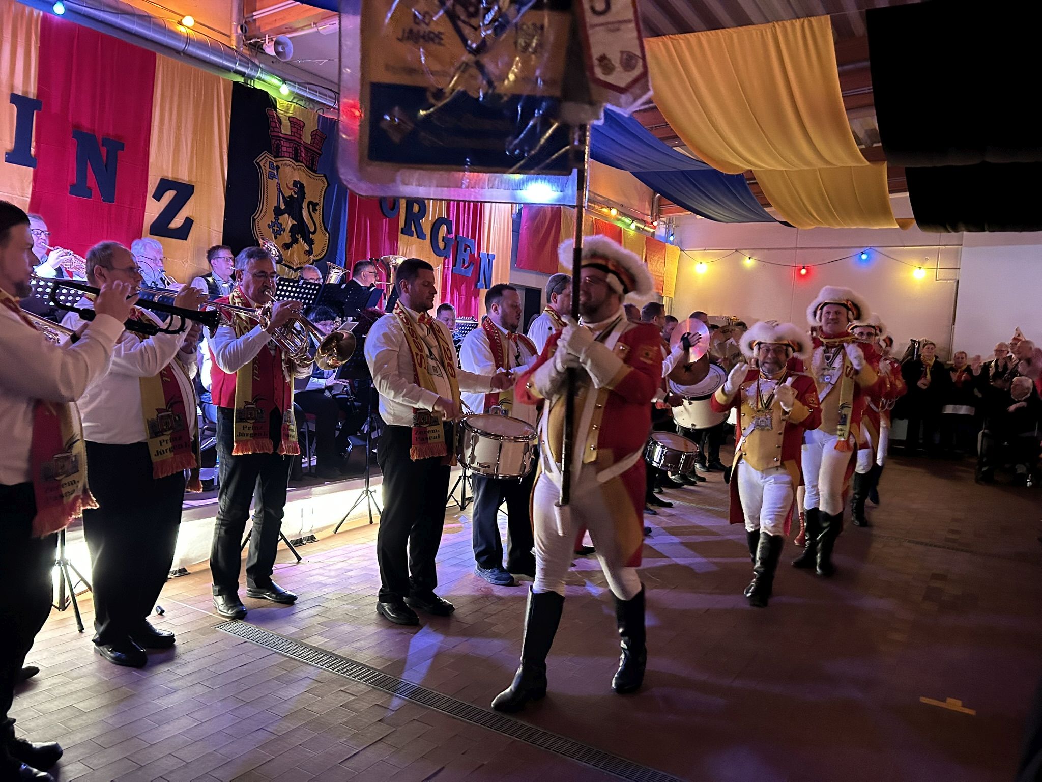 Dann folgte der erste große Höhepunkt des Abends – Prinz Jürgen I. und sein Zeremonienmeister Pascal mit ihrem gesamten Tross fluteten den Saal! Wie es die Tradition will, wurden beide von unserem Wehrleiter Christian Haake mit der besonderen Ehrentafel zum Prinzenempfang geehrt. Anschließend durften beide in der ersten Reihe Platz nehmen und zwei Stunden lang das Programm genießen.