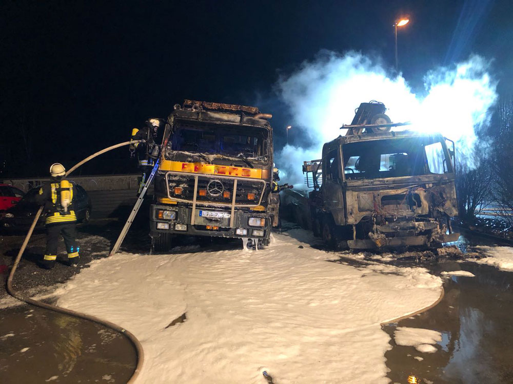 Vor Ort stellten die Einsatzkräfte fest, dass zwei LKW eines dort in der Nachbarschaft ansässigen Abschleppunternehmens lichterloh brannten. Direkt wurde eine Brandbekämpfung zunächst mit Wasser und dann mit Löschschaum vorgenommen. Die vorgehenden Trupps schützten sich gegen die Atemgifte im Rauch mit Atemschutzgeräten.