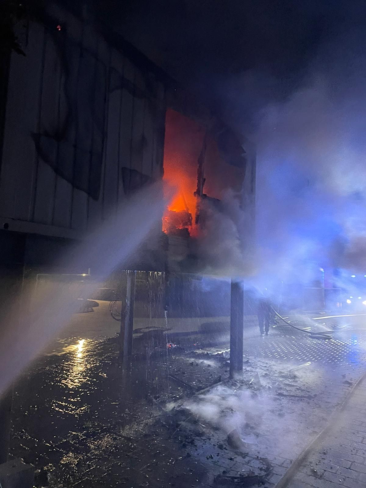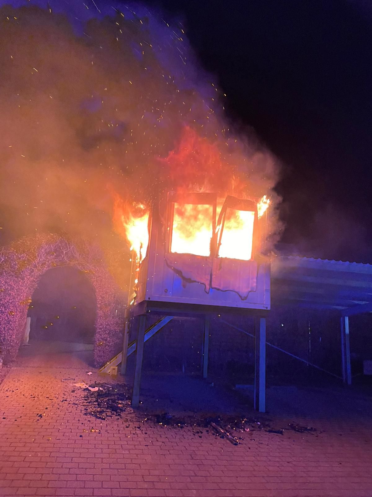 Vor Ort bestätigte sich das Meldebild. Der aufgeständerte Bürocontainer brannte in voller Ausdehnung. Angrenzende Bäume und Hecken wurden durch das Feuer bedroht. Unverzüglich wurden mehrere Strahlrohre zur Brandbekämpfung eingesetzt. Ebenfalls wurden ehrenamtliche Löschzüge zur Unterstützung alarmiert.
