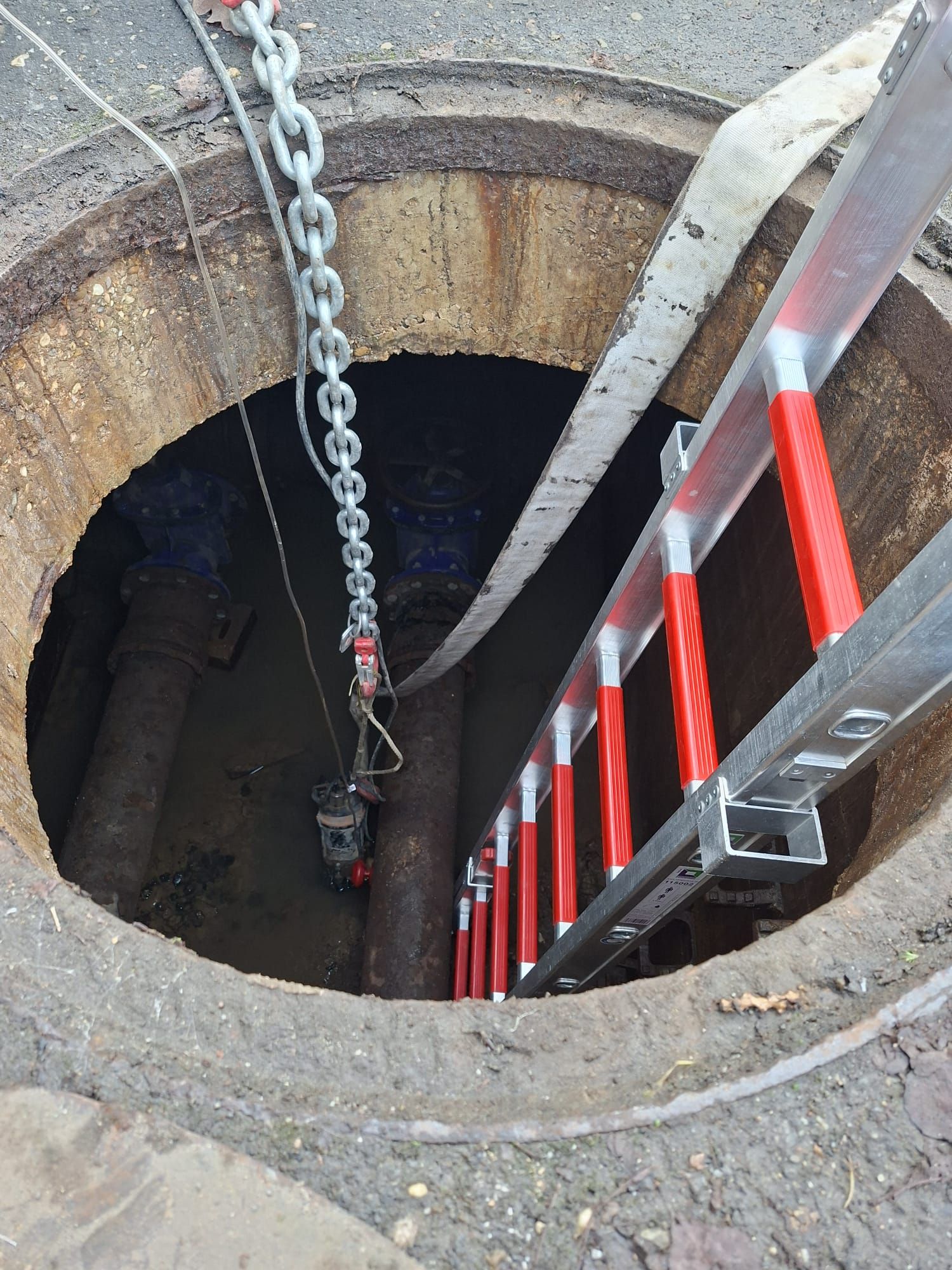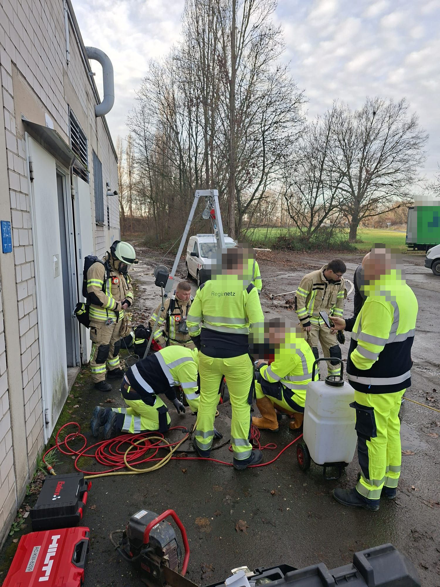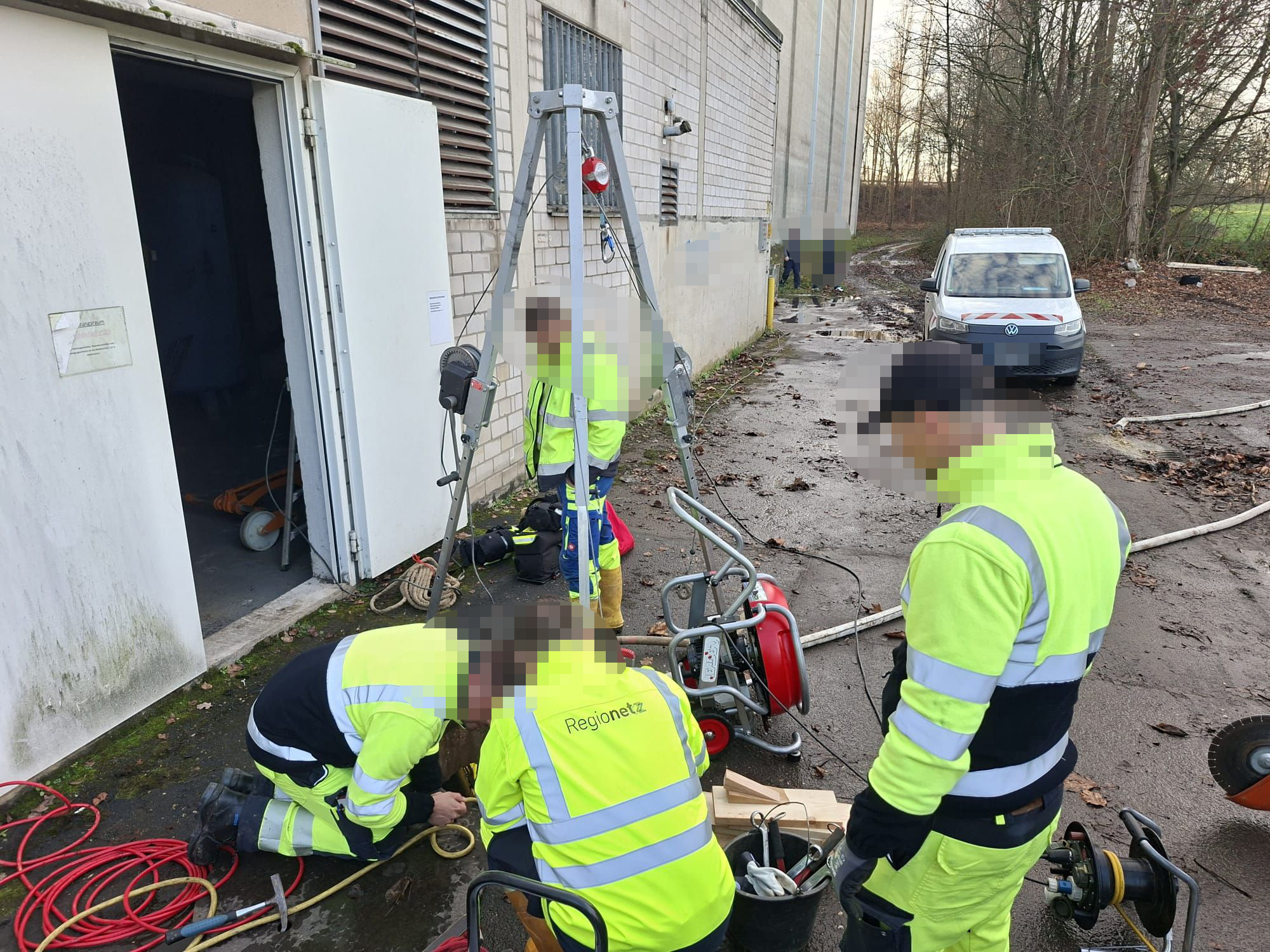 Um 14:00 Uhr rückten unser Führungsdienst und ein Fahrzeug des zuständigen ehrenamtlichen Löschzuges 42 (Bohl) erneut zur Einsatzstelle aus. Nachdem das ausgetretene Wasser größtenteils abgeflossen war, wollte der Energieversorger mit der Reparatur der defekten Leitung beginnen und hatte uns zur Unterstützung angefordert. Durch unsere Einsatzkräfte wurde das verbliebene Wasser aus dem Rohrkanal abgepumpt. Anschließend wurden Hochleistungslüfter eingesetzt, damit die im Rohrkanal tätigen Handwerker ausreichend mit Frischluft versorgt waren. Zur Sicherung der eingesetzten Kräfte wurde ein Angriffstrupp unter Atemschutz in Bereitstellung gehalten, der im Notfall sofort gefährdete Handwerker aus dem Rohrkanal hätte retten können.