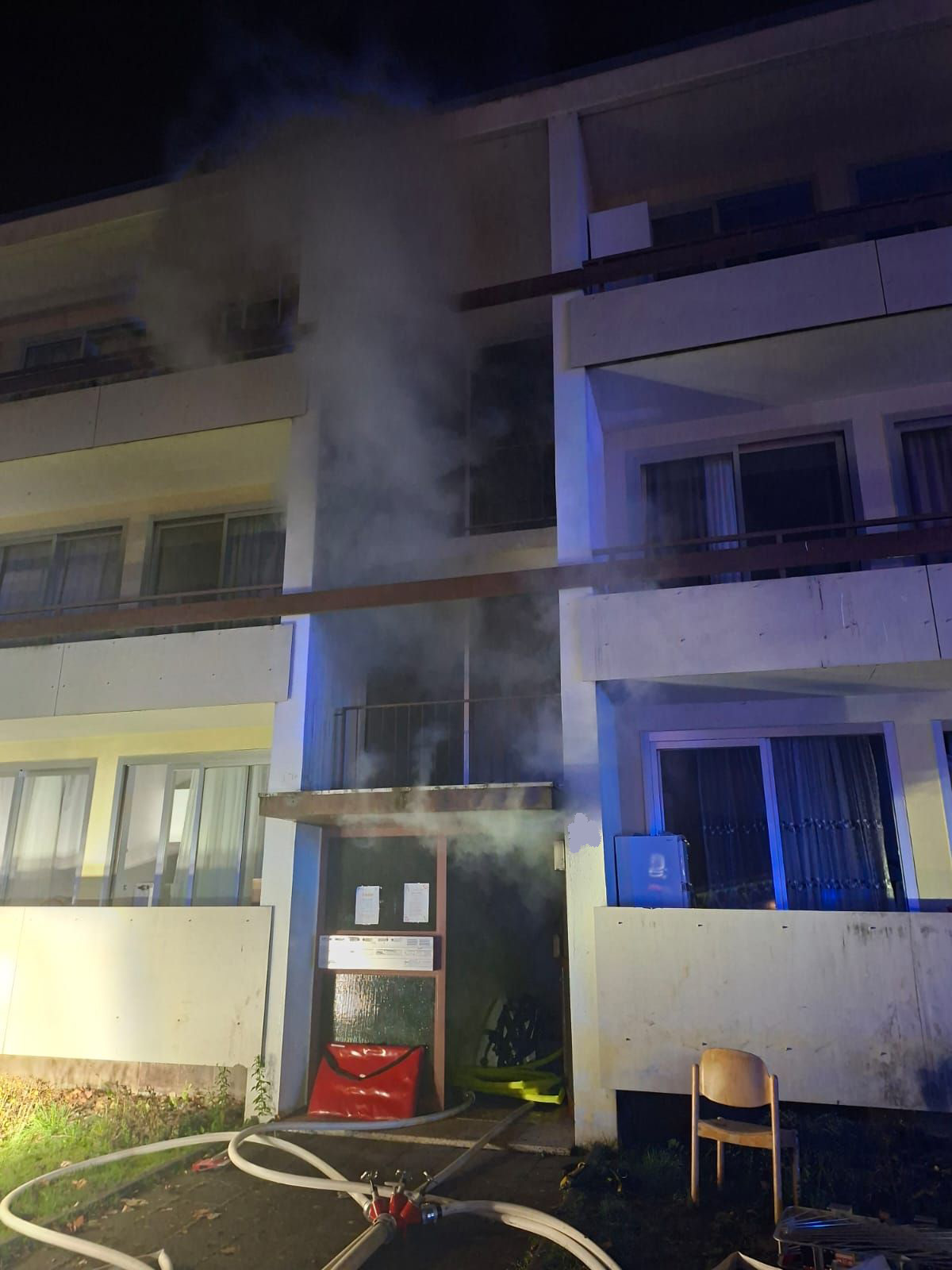 Bei Eintreffen der ersten Einsatzkräfte an der Einsatzstelle bestätigte sich das Meldebild. Aus einem Mehrfamilienhaus drang dichter Rauch ins Freie. Auch der Treppenraum war stark verraucht und nicht mehr sicher zu benutzen. Auf Balkonen des Gebäudes machten sich mehrere Personen bemerkbar, die sich nicht mehr selber retten konnten. Unverzüglich wurde die Rettung dieser Personen über die Drehleiter eingeleitet. Insgesamt sieben Personen (vier Erwachsene und drei Kinder) konnten unsere Einsatzkräfte schnell retten und in Sicherheit bringen.