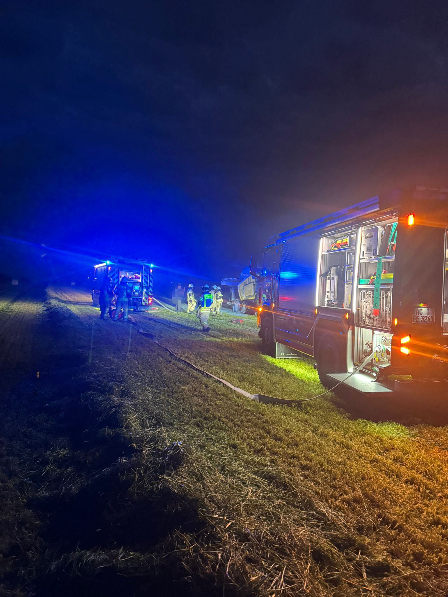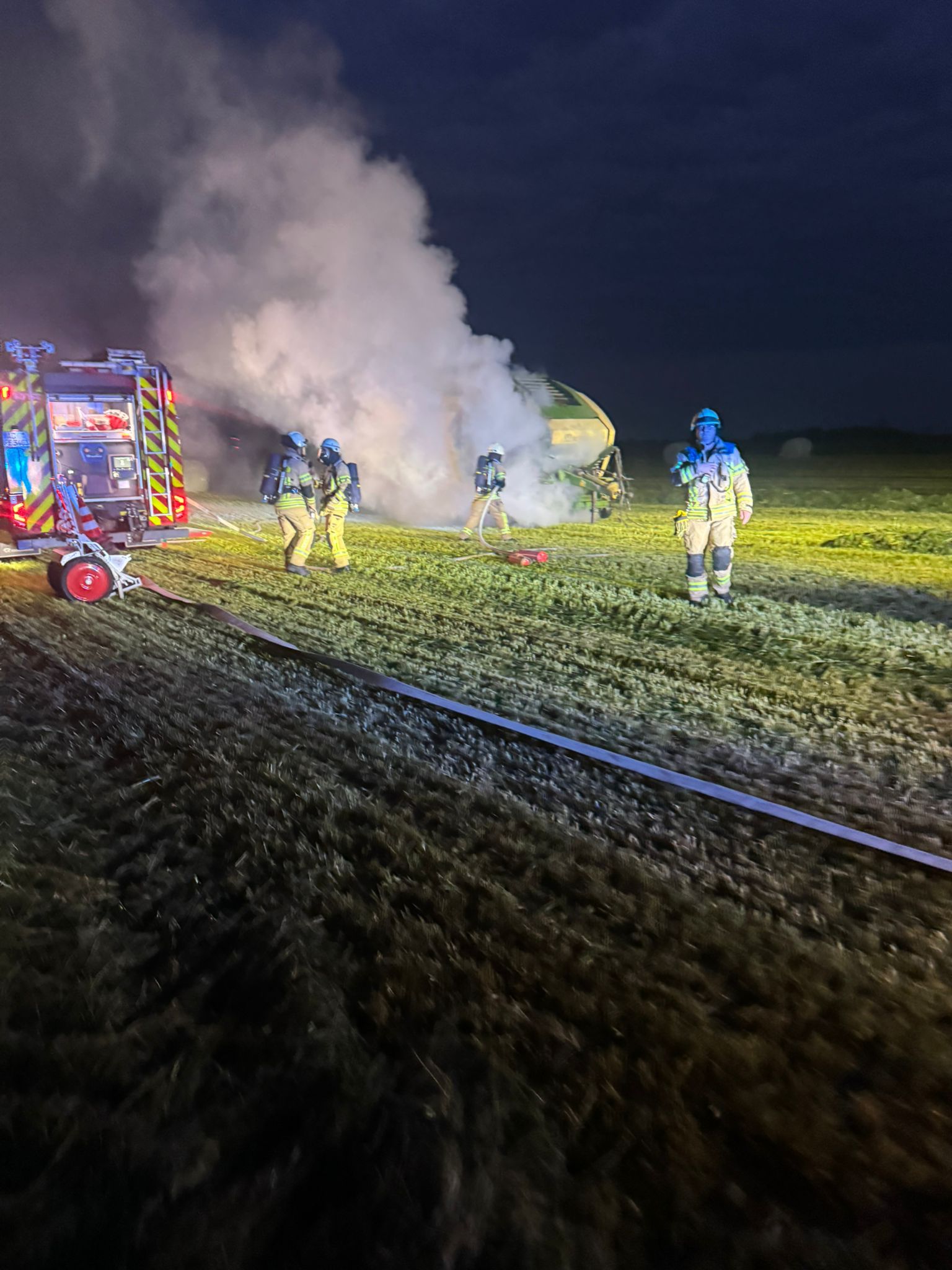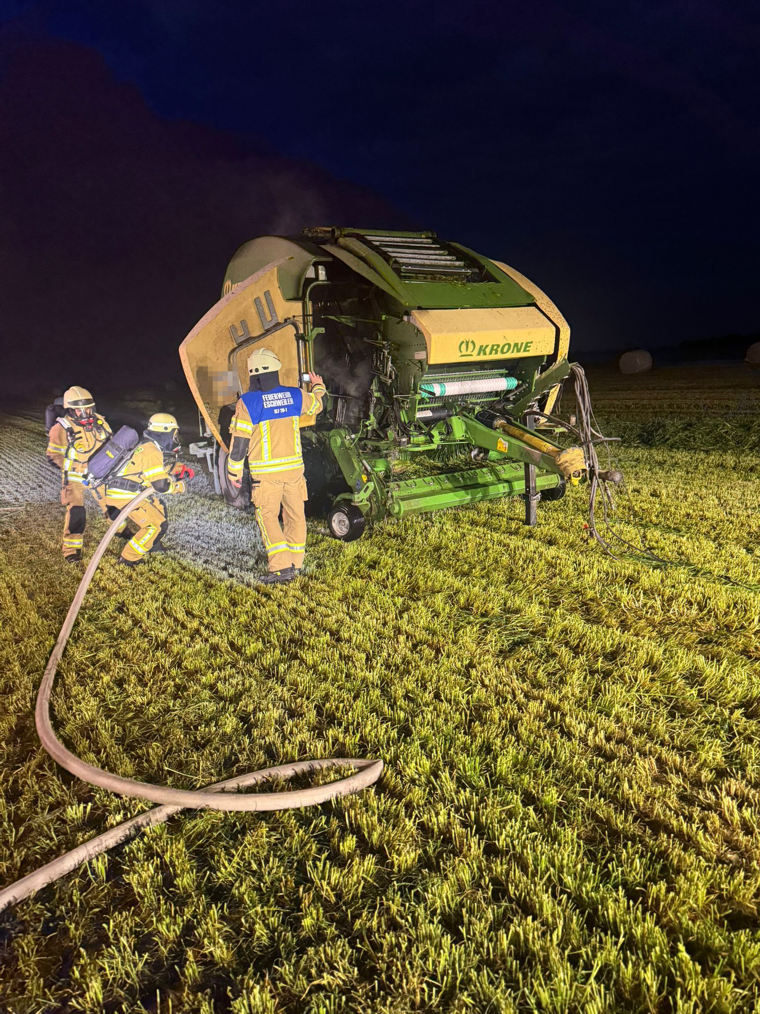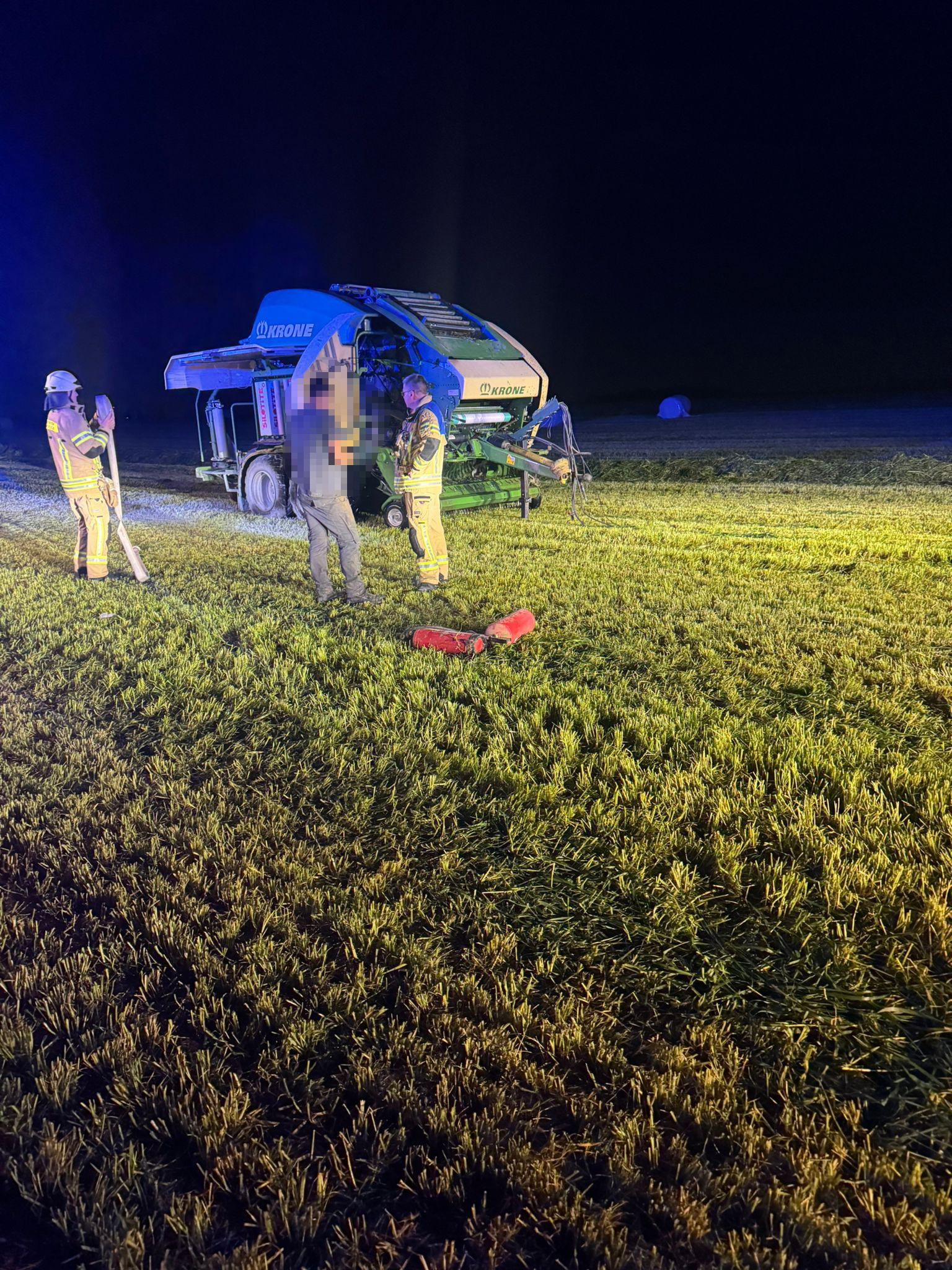 Bei der Grassilage-Ernte war eine Rundballenpresse aus unbekannter Ursache in Brand geraten. Der Landwirt hatte noch vor Eintreffen unserer Einsatzkräfte die Maschine vom Traktor abkuppeln können und so eine weitere Gefährdung unterbunden. Mit zwei tragbaren Feuerlöschern versuchte er eine erste Brandbekämpfung. Unsere Einsatzkräfte setzten ein Strahlrohr unter Atemschutz ein, um den Brand zu löschen. Von weiteren Einsatzkräften wurde eine Löschwasserversorgung errichtet.